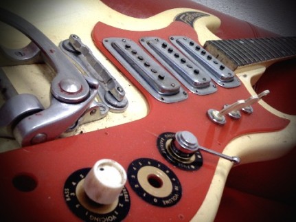 It’s in need of a total refurb, but it’s an excellent example of the model. All the parts are there, including the rare cast Bigsby moustache bridge and Bigsby tremolo. And those switches! They look like they come from a 1950’s rocketship! I’ve only seen another Fyrbyrd with those switches, and that’s Brad Shepherd from Hoodoo Gurus’ guitar. I have no idea why Maton put these on only a few guitars… all the Fyrbyrds I’ve seen sport the regular Fender Jag type switches. I’m guessing the early Fyrbyrds had these and were switched later, as they do get in the way while playing. I love them, though.
