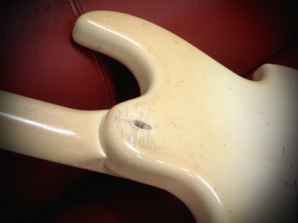 The guitar has led a pretty rough life. It’s covered in nicks, rubs and scratches and the white has mellowed to a beautiful cream/nicotine colour. Pure aussie mojo. The neck strap button is missing and looks like it was hacked out. Easy fix.
