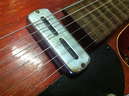 This story starts with a lady named Sally, who is the saxaphone player in my band ‘The Horrortones’ and who happens to own a great music store in Brisbane’s West End called Audrey’s Music Shop. I’d designed Sally’s logo and business cards, so in payment her guitar repairer Ben was doing some work on my guitar. I’d dropped in one weekend to pick it up and while I was chatting to Ben (he looooooves to chat) I noticed a nice old red hollow body on the wall with a very familiar looking Maton pickup installed. My guitarnerd instincts told me that this had to be an Alver. After asking if I could have a quick strum, Ben said go ahead, plug her in. Wow, what a beauty…
